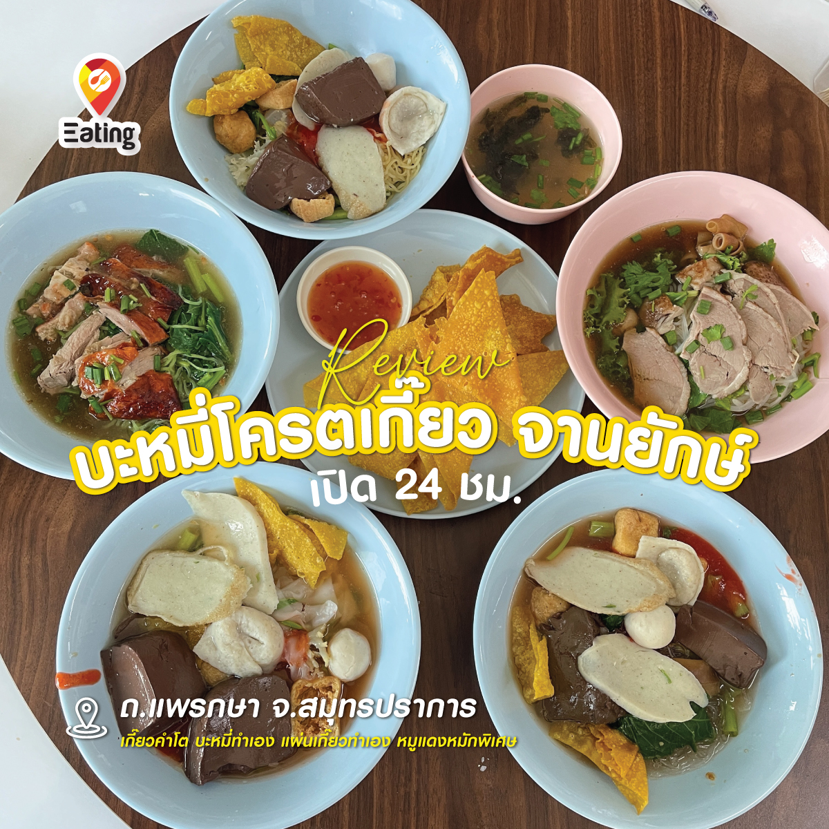 บะหมี่โคตรเกี๊ยวจานยักษ์ เปิด 24 ชม. ถ้าคุณเป็นสายบะหมี่ ต้องห้ามพลาด! “บะหมี่โคตรเกี๊ยวจานยักษ์” ร้านบะหมี่ที่จัดเต็มทั้งเส้นเหนียวนุ่ม เกี๊ยวตัวโต ไส้แน่นทะลัก เสิร์ฟมาในจานยักษ์สะใจ พร้อมน้ำซุปกลมกล่อมหอมกลิ่นกระดูกหมู เคี่ยวจนได้รสชาติที่เข้มข้นสุดๆ