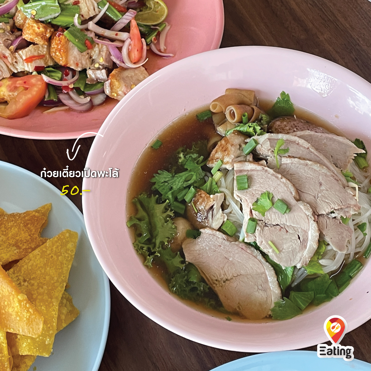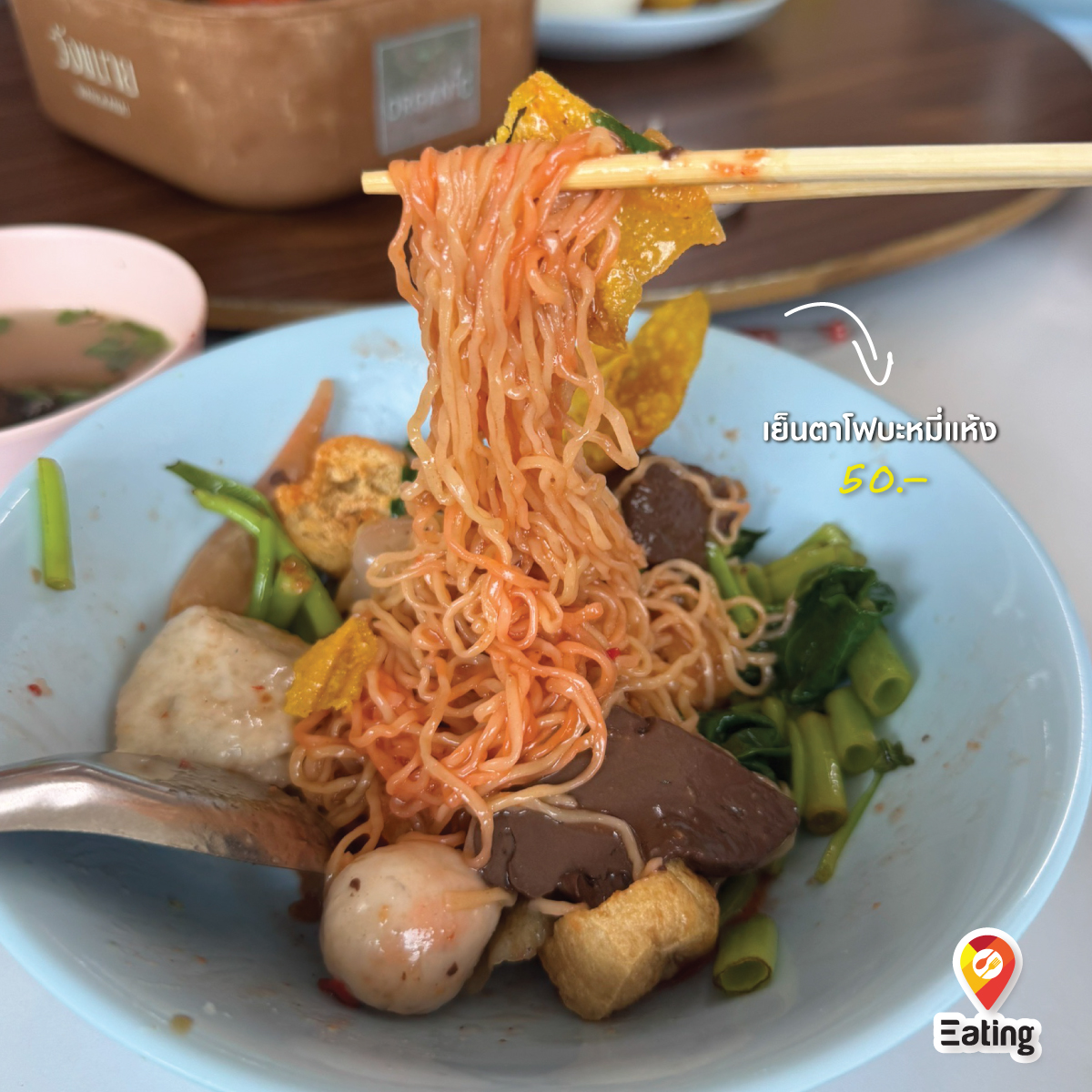 But that's not all — this place offers more than just noodles. You can also enjoy Yen Ta Fo, roasted duck noodles, braised duck noodle soup, and tasty snacks like boiled meatballs and crispy wontons. And don’t miss out on their spicy Thai-style salads (yum) — packed with flavor and sure to impress!