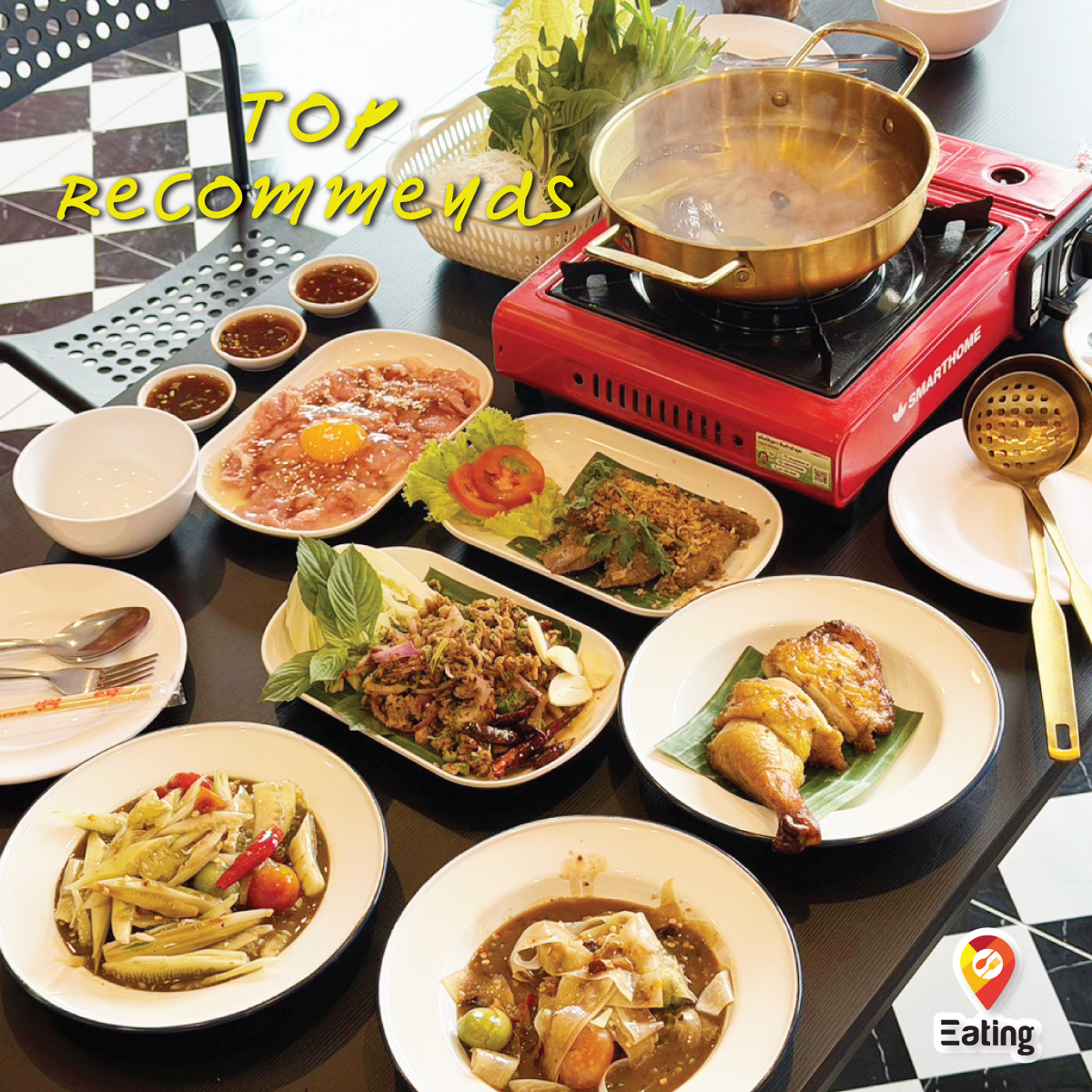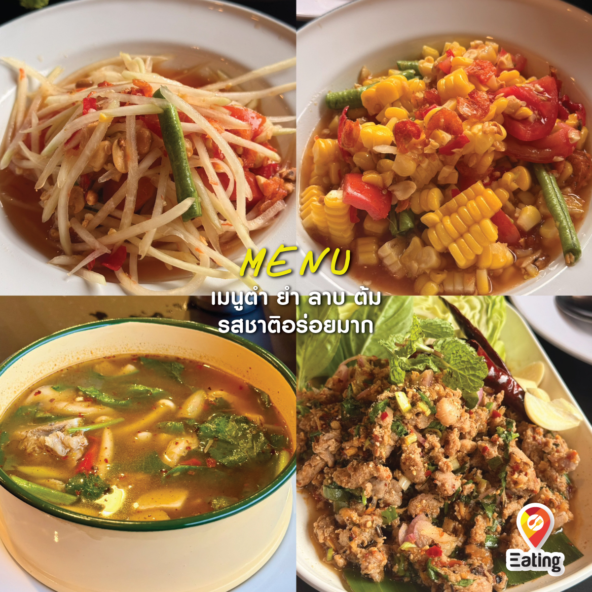 👉 Thai papaya salad with salted egg, tam sua, cucumber salad, spicy soup with soft bone pork, pork om soup, three-mushroom curry, egg curry soup,